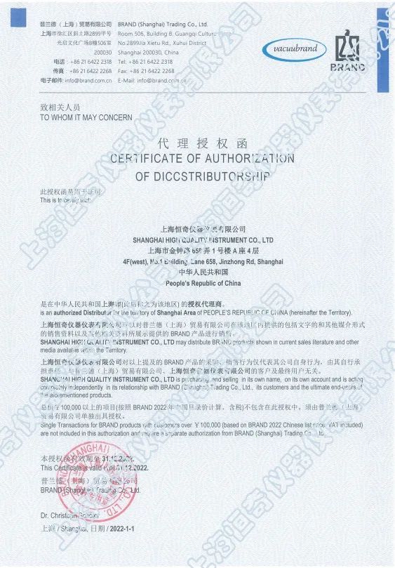 上海恒奇儀器儀表有限公司多年來一直是BRAND優秀授權經銷商,為客戶提供專業的服務,合理的價格,高效的售后服務,良好的信譽與廣大客戶建立了長期友好的合作伙伴關系。
