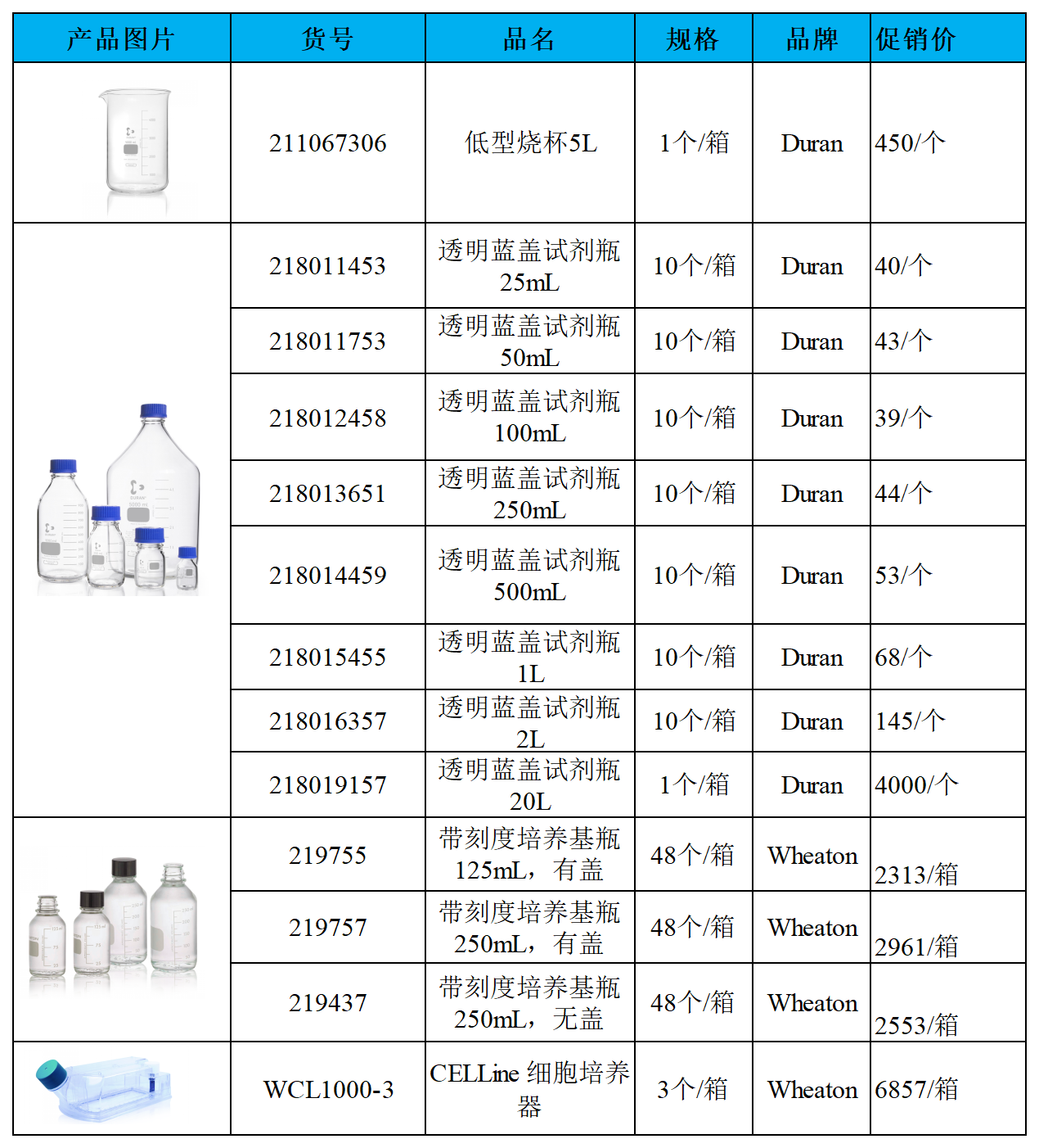 為了回饋新老客戶的支持,上海恒奇儀器為廣大用戶提供DWK明星產品現貨大促銷福利,包括DURAN藍蓋瓶,燒杯,WHEATON培養基瓶,CELLine 細胞培養器。詳情如下: