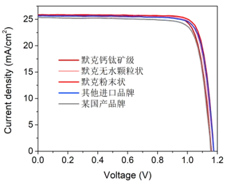 在實際測試的過程中,使用默克純度為99.999%的碘化鉛材料(貨號203602),相對于其他品牌的材料,轉(zhuǎn)換效率(PCE)的提升可高達(dá)1%。與其他進(jìn)口品牌相比,該產(chǎn)品的實際器件表現(xiàn)同樣占據(jù)明顯的優(yōu)勢。