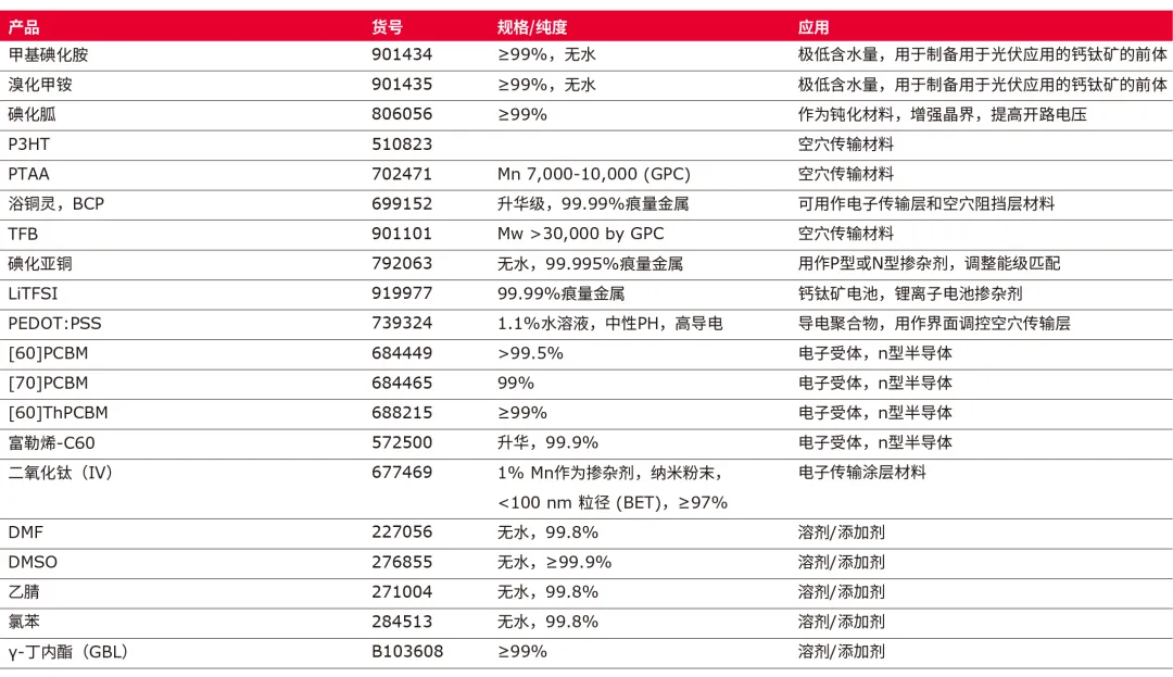 聯(lián)系我們,為您提供Sigma-Aldrich®材料在鈣鈦礦電池應(yīng)用的詳細(xì)數(shù)據(jù)和優(yōu)惠報價。