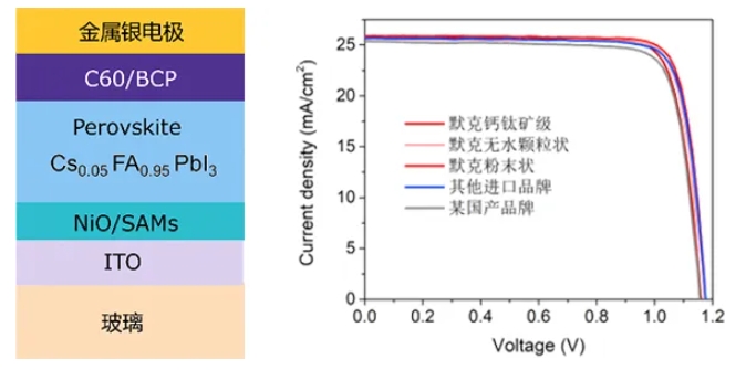 在實際測試的過程中,使用默克純度為99.999%的碘化鉛材料(貨號203602),相對于其他品牌的材料,轉換效率(PCE)有著明顯的提升。與其他進口品牌相比,該產品的實際器件表現同樣占據明顯的優勢。