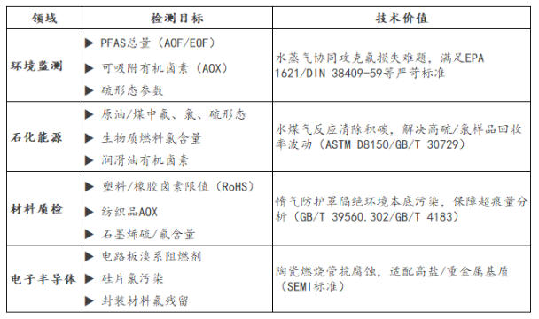 這場戰役的破局點,在于對“氟”的終極掌控——而氟,僅是鹵素家族的一員。當全球監管風暴席卷PFAS,氯、溴、碘及硫的精準測定需求同步激增。從電子電器RoHS管控到生物質燃料氯限值,從原油硫形態到紡織品AOX,多基質樣品中鹵素與硫的分析,已成為環境、化工、電子等多領域的共性技術剛需。