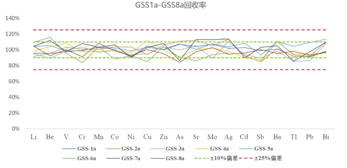 使用PlasmaQuant MS進(jìn)行分析,由以上結(jié)果可知,19種元素回收率大大優(yōu)于標(biāo)準(zhǔn)要求,并且GSS1a,GSS2a19種元素回收率均滿足標(biāo)準(zhǔn)樣品證書不確定度范圍的要求。
