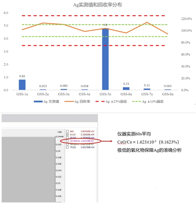 實(shí)際測(cè)試結(jié)果,Ag測(cè)試值均在標(biāo)準(zhǔn)樣品的不確定度范圍內(nèi),且準(zhǔn)確度也滿足方法要求。