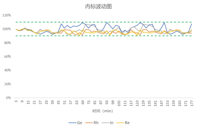 最后一個(gè)難點(diǎn)內(nèi)標(biāo)穩(wěn)定性,因?yàn)橥寥阑w和曲線基體不同,導(dǎo)致在土壤分析過程中內(nèi)標(biāo)容易漂移,而儀器的穩(wěn)定性則是分析的關(guān)鍵。