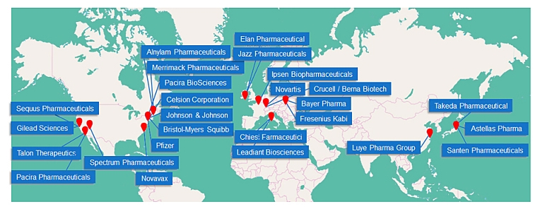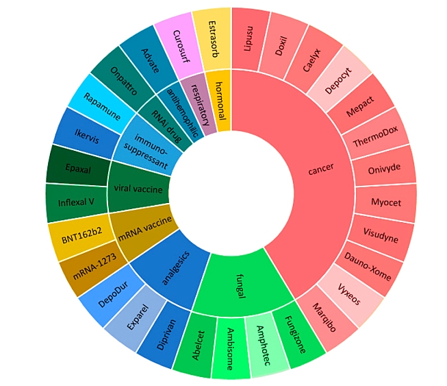 半個多世紀以來,脂質體一直被認為是醫(yī)學的強大工具,能夠將治療藥物可控地封裝并輸送到體內特定位置,這使得它們可用于治療各種疾病。許多LNP藥物制劑已獲批上市并用于醫(yī)療實踐(圖1)。根據(jù)最近的市場分析以及基于LNP的已上市藥物信息,全球脂質體藥物遞送市場的主要參與者如圖2所示。